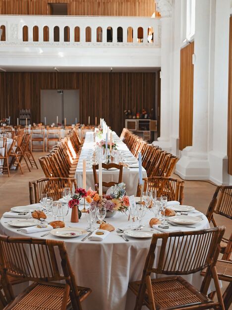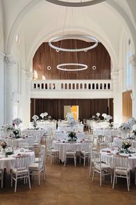 Spacieuse et lumineuse, la salle de la Chapelle permet de nombreuses configurations pour les mariages et grandes réceptions. Sous un plafond voûté, entre vitraux colorés et colonnes imposantes, cette salle offre une atmosphère à la fois solennelle et élégante.
