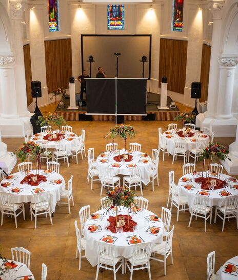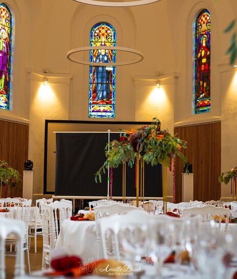 Pour les mariages avec un grand nombre d'invités, la Salle de la Chapelle est l'espace privilégié. Avec ses 235 m², elle offre une capacité d'accueil confortable pour un cocktail dînatoire ou un vin d'honneur important jusqu’à 200 personnes debout.